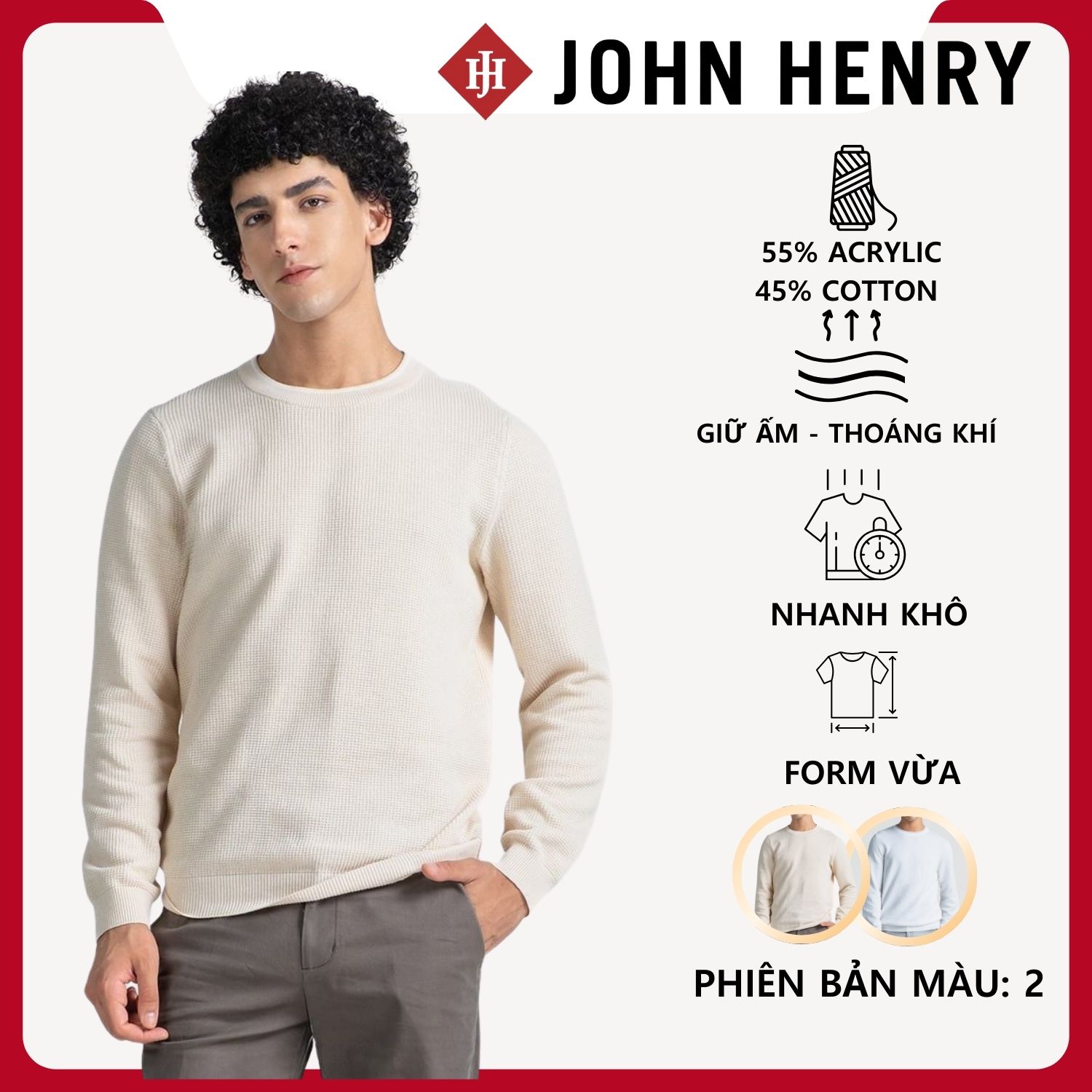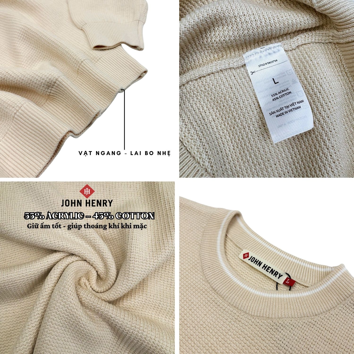 - Chất liệu 55% acrylic kết hợp 45% cotton tạo nên bề mặt len dày dặn và thoáng khí. Áo vừa giữ ấm hiệu quả, vừa mang lại cảm giác thoải mái cho người mặc trong suốt ngày dài.