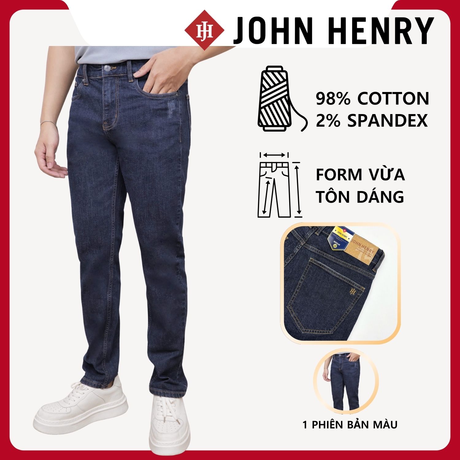 - Chất liệu 98% cotton và 2% spandex mang lại sự mềm mại cùng độ co giãn nhẹ, giúp người mặc di chuyển thoải mái mà vẫn giữ được phom dáng gọn gàng.