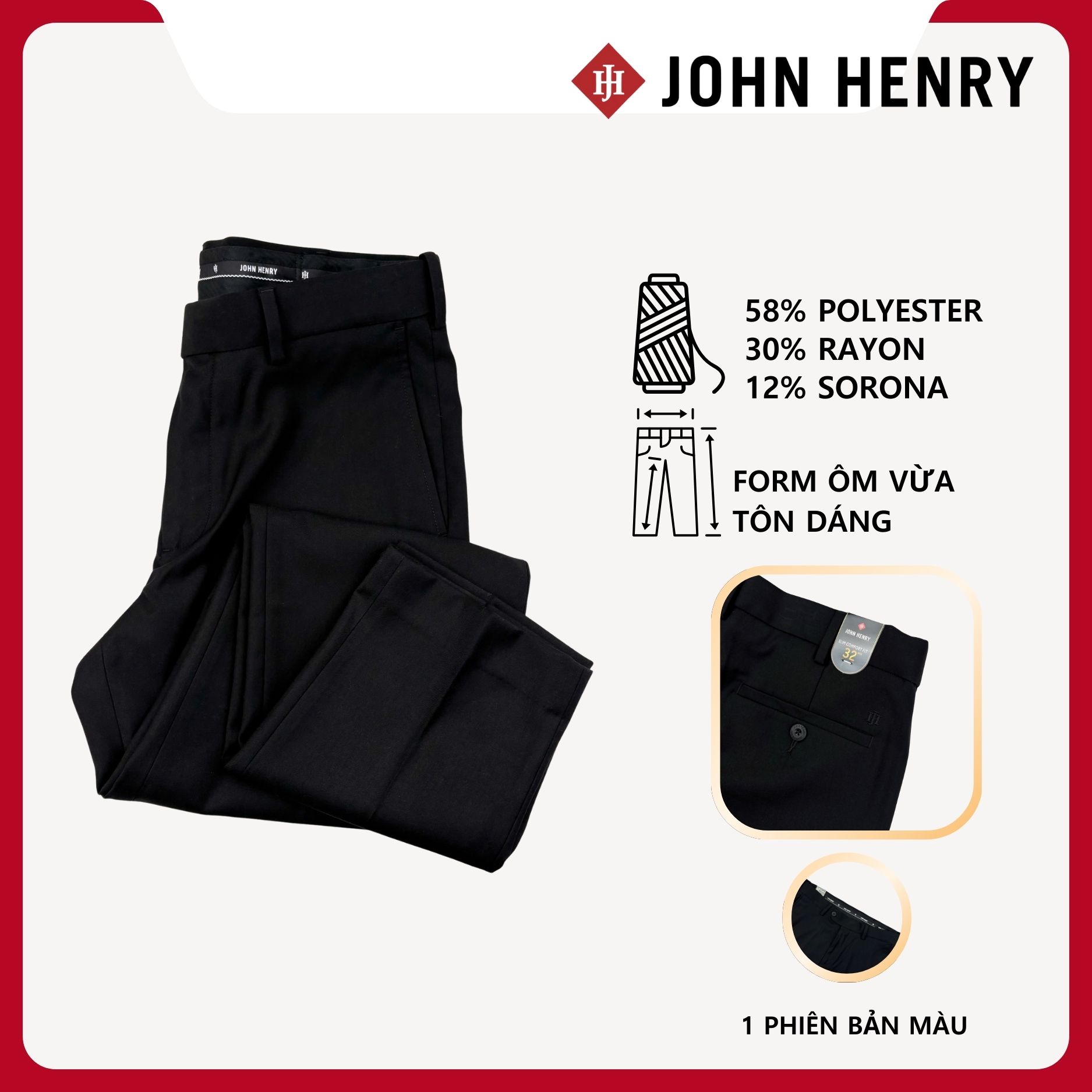 - Chất liệu 58% polyester,30%Rayon và 12% Sorana mang lại bề mặt vải mịn, thoáng và có độ co giãn nhẹ. Quần giữ phom chuẩn, hạn chế nhăn, giúp người mặc thoải mái mà vẫn giữ được vẻ chỉnh tề.
