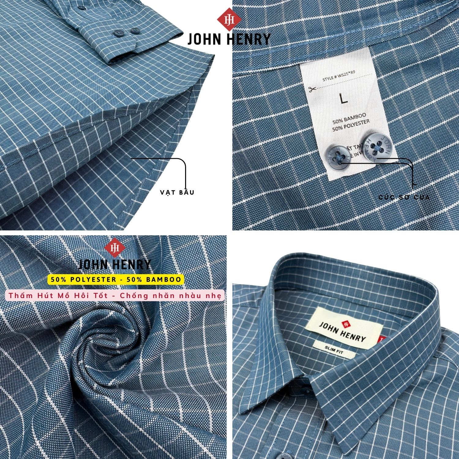 - Áo sơ mi 50% Bamboo và 50% Polyester giúp thấm hút mồ hôi, thoải mái và co giãn nhẹ khi mặc.